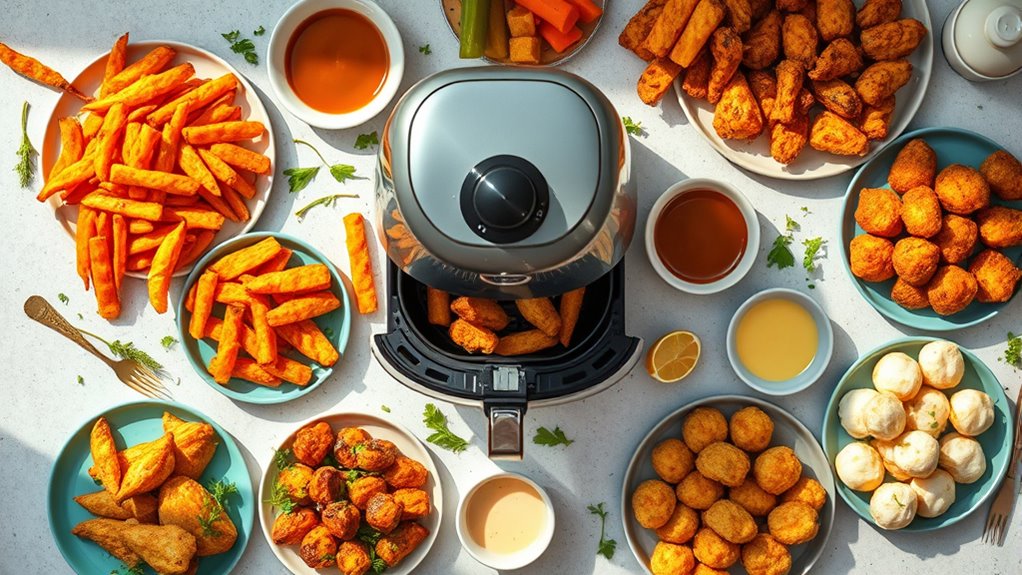 You can definitely cook multiple items at once in an air fryer! I often layer or use the basket’s divider to maximize space. Just make sure to adjust the cooking time and shake or flip the food halfway through. It’s a great way to save time and prepare a variety of snacks or meals quickly. Just keep an eye on everything to guarantee even cooking and avoid overcrowding.