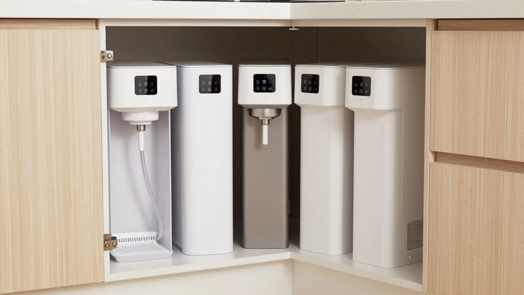 If you’re looking for the best compact RO systems for small cabinets, I’ve found options like tankless models, space-saving designs, and certified units that remove over 99.99% of contaminants. These systems are easy to install, maintain, and often come with features like leak prevention and real-time filters status. They’re perfect for small spaces without sacrificing water quality. Keep going, and I’ll guide you through the top choices tailored for space-conscious homes.
