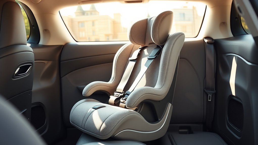 Have you ever struggled to fit multiple car seats in a small vehicle? Space-saving convertible car seats with load legs are designed to help. They typically have a slim profile, around 16 to 17 inches wide, allowing you to fit more seats across the backseat. The load leg extends from the base to the vehicle floor, providing extra stability and reducing seat movement. This feature is especially useful in tight spaces, as it helps maximize backseat capacity. Many models have adjustable load legs, so you can customize the fit based on your vehicle’s floor height. The compact footprint of these seats ensures you don’t compromise safety or comfort while making the most of limited space, making them ideal for smaller cars or crowded backseats.