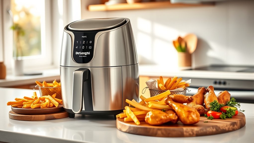 If you’re looking for the best De’Longhi Rapid Crisp Air Fryers for crispy, healthy meals in 2025, I’ve found top options that offer fast cooking times, large capacities, and easy controls. These models combine advanced heat technology, safety features, and versatile functions like baking and dehydrating. They’re perfect for busy kitchens and batch cooking. Keep going, and you’ll discover detailed insights to help you choose the right one for your needs.