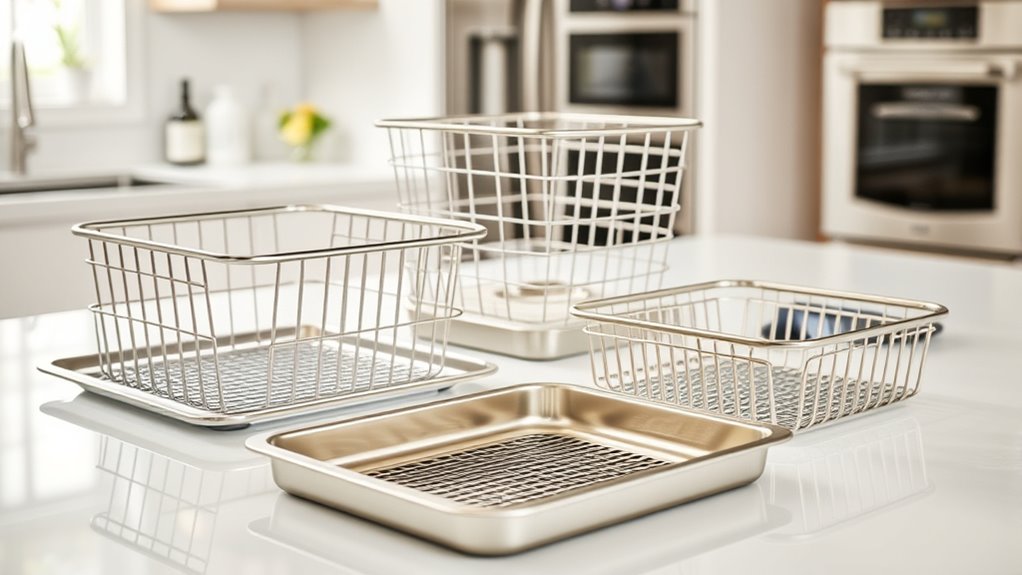 If you’re looking for reliable dishwasher-safe air fryer parts sets in 2025, I’ve found a variety that fits popular models like Ninja, Instant Pot, and Emeril Lagasse. These sets include trays, baskets, crisper plates, and accessories made from food-grade stainless steel and silicone, ensuring durability and safety. They’re easy to clean and compatible with many appliances, making healthy cooking more convenient. Keep going—there’s plenty more to help you pick the perfect set to suit your needs.