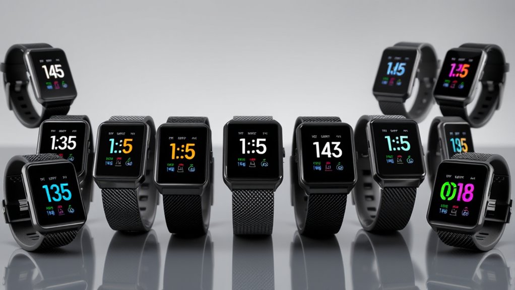 When selecting a fitness tracker watch with GPS, comfort should be a top priority to guarantee you can wear it all day without discomfort. I look for lightweight models, ideally under 50 grams, so it doesn’t feel bulky on my wrist. Adjustable straps made from breathable, skin-friendly materials like silicone or nylon help ensure a secure fit during different activities. An ergonomic design with curved screens and smooth edges reduces skin irritation, making extended wear more comfortable. The watch face size and display resolution should be easy to read without being obtrusive. Additionally, customizable straps and watch faces allow me to match my style while enhancing overall comfort. Prioritizing these factors guarantees my tracker stays comfortable during all-day wear and workouts.