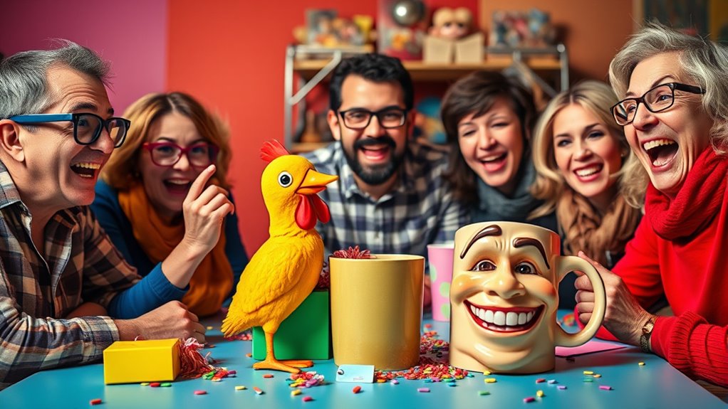For office parties, I love giving prank items like fake spilled coffee mugs or humorous desk signs. They’re lighthearted and get laughs without crossing any lines. I also consider silly gadgets like giant pencils or quirky stress balls shaped like funny animals. These gifts break the ice and create a fun atmosphere. Remember, the best gag gifts are playful, not offensive, so I always choose items that everyone can enjoy and share a laugh over.