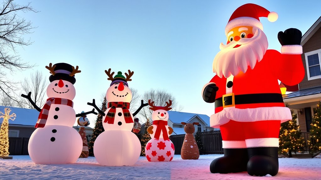 If you’re looking to turn your yard into a festive wonderland, I recommend checking out giant inflatables between 12 and 20 feet tall. These options feature bright LED lights, vibrant colors, and fun themes like Santa, dinosaurs, and elves to really catch everyone’s eye. They’re easy to set up and designed to withstand outdoor weather. For a detailed guide on the best choices and tips for your display, keep exploring further.