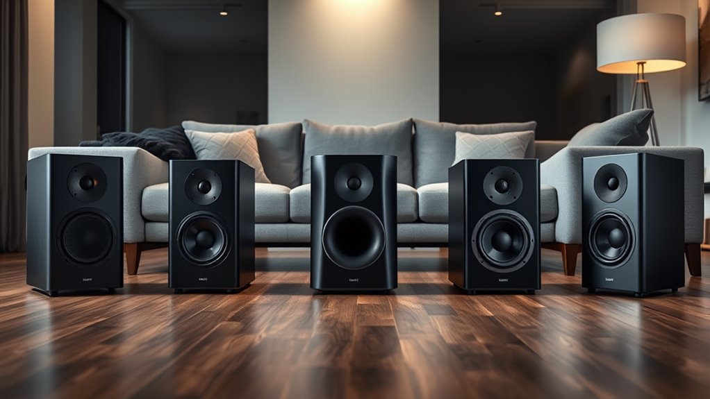 Setting a clear budget is essential to narrowing down your options and avoiding overspending on features you don’t need. Hi‑Fi speaker systems range from budget-friendly models around $50 to premium setups costing thousands. By defining your price range, you can focus on models that offer the best value for your money. It’s important to contemplate the balance between cost and features, making sure the system provides essential functions without breaking the bank. Keep an eye out for sales, discounts, and bundle deals, which can considerably lower the overall cost of quality systems. Sometimes, investing a bit more upfront in a higher-priced model pays off with better durability, sound quality, and future-proofing, ensuring your system remains satisfying for years to come.
