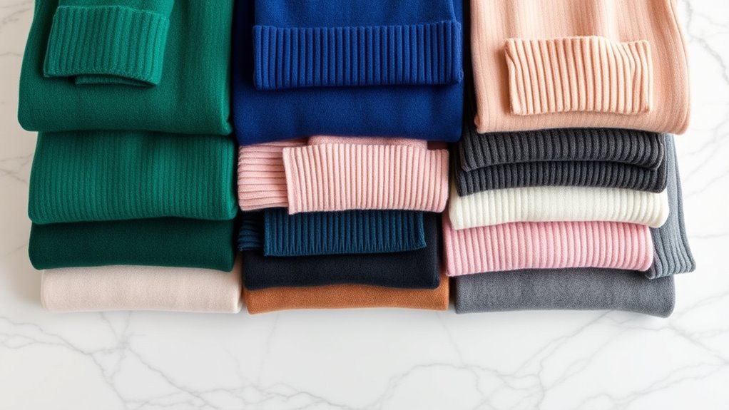 Have you ever considered how color and style choices can elevate your cashmere sweater collection? The variety of colors—from timeless neutrals to bold, vibrant shades—gives you versatility for any occasion. Picking a hue that complements your wardrobe guarantees easy pairing with different outfits, whether casual or formal. Subtle styles like crew necks and V-necks are classic, offering timeless elegance and adaptability. Bright or bold colors can make a statement but require careful consideration of your skin tone and existing wardrobe to enhance their flattering effect. Choosing styles with multiple color options provides flexibility, allowing you to mix and match accessories or outerwear effortlessly. Thoughtful selection in both color and style helps you build a sophisticated, versatile cashmere collection that truly reflects your personal taste.