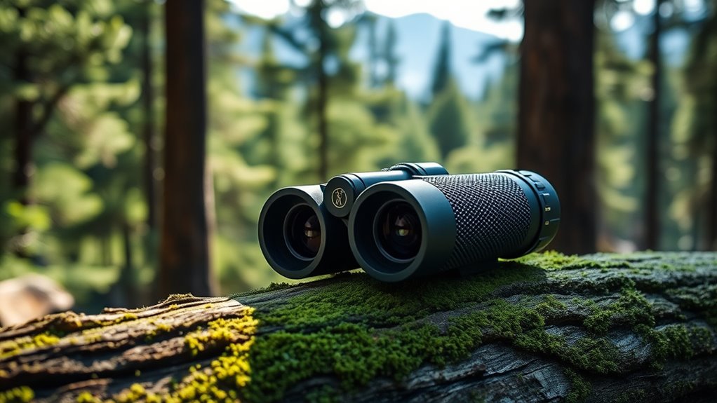 Binocular weight considerably impacts extended hunting sessions because heavier models can cause fatigue, making it harder to stay focused and comfortable. I notice that lightweight binoculars reduce strain on my neck and arms, allowing me to observe longer without discomfort. If you’re planning long hunts, I recommend choosing a lighter pair, even if it means sacrificing a bit of extra features. Comfort and stamina are key to a successful hunt.