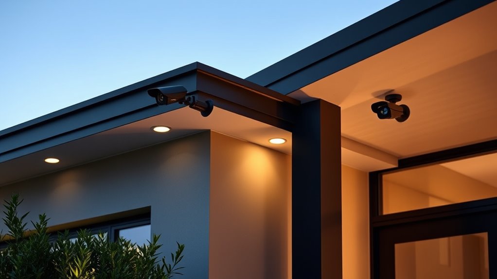 Selecting a reliable power source and stable connectivity options is essential for guaranteeing your home security camera system works smoothly around the clock. I recommend choosing systems with rechargeable batteries, PoE (Power over Ethernet), or continuous power supply to prevent interruptions. Verify the connectivity options, such as dual-band Wi-Fi (2.4GHz and 5GHz) or wired Ethernet, to ensure fast, stable data transmission. Consistent internet access is critical for remote monitoring via apps or web interfaces, enabling live streaming and instant notifications. Also, consider compatibility with your existing smart home setup and Wi-Fi network to streamline control and automation. Lastly, confirm the system’s wireless range or Ethernet cable length covers your entire property without signal loss, guaranteeing extensive coverage and reliable performance.