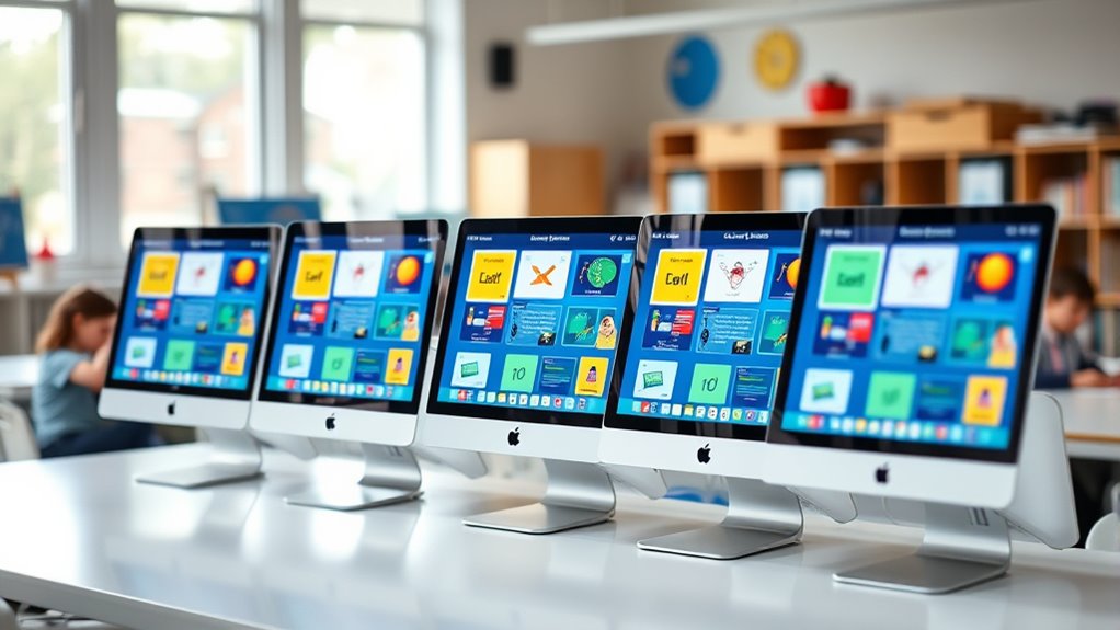 If you’re looking to boost learning and creativity in your classroom, I recommend considering the latest 2024 iMac models powered by the M4 chip. They offer stunning 4.5K Retina displays, vibrant colors, and powerful performance with up to 16GB of unified memory, perfect for multimedia projects and collaborative work. Their sleek design and security features make them ideal for educational environments. Keep going to discover the top six options that can truly transform your labs.