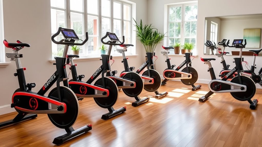 Looking to upgrade your home gym in 2025? I recommend exploring the top indoor cycling bikes that combine powerful magnetic resistance, digital monitors, and app compatibility for immersive workouts. Many models offer adjustable features, space-saving foldability, and high weight capacities, making them perfect for various spaces and user needs. If you want to find the best fit for your fitness goals, keep going—there’s plenty more to discover.