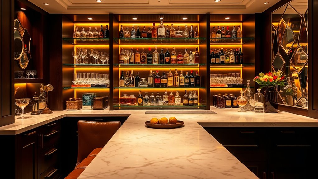 I recommend using sleek, built-in cabinetry with glass-fronted shelves for a luxurious look, providing ample space for bottles and glassware. Incorporating drawers with dividers keeps bar tools organized, while a wine fridge or chilled drawers ensure your beverages stay fresh. Hidden storage options or custom cabinetry can add elegance and maximize space. I love combining functionality with style to create a bar that’s both practical and visually stunning.