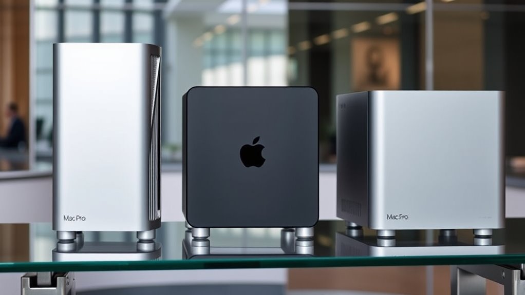 Imagine a fortress protecting your data—that’s what the latest Mac Pro models offer with their advanced security features. They include hardware encryption, Secure Enclave, and hardware-based authentication, making unauthorized access nearly impossible. Plus, they support macOS security updates and Apple’s T2 chip, ensuring your enterprise data stays safe from cyber threats. It’s like having a high-tech security guard built right into your workstation.