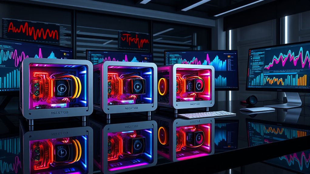 The GPU power of a Mac Studio directly influences its ability to handle machine learning tasks efficiently. Higher core counts, like 16 or more, deliver increased parallel processing, which speeds up training and inference. Pairing a robust GPU with ample unified memory guarantees the system can manage large datasets and complex models without bottlenecks. Hardware features like dedicated media engines and hardware-accelerated ray tracing further enhance GPU performance, optimizing data processing. Selecting a Mac Studio with a powerful GPU reduces training times and boosts throughput, making it ideal for compute-intensive machine learning applications. Ultimately, investing in a high-performance GPU ensures your workflows run smoothly and efficiently, translating to faster results and improved productivity in your machine learning projects.