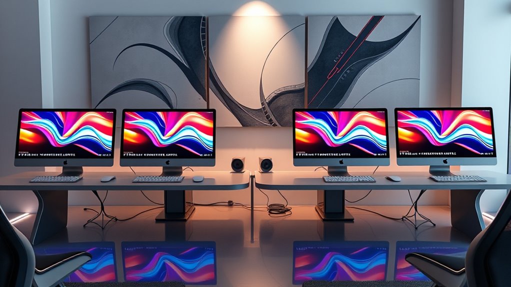 Ever wondered if your Mac Studio has the right ports to support all your peripherals and displays? It’s vital to check for multiple Thunderbolt 4 and USB-C ports, along with HDMI outputs, to connect various devices easily. High-speed Ethernet options, like Gigabit or 10Gb Ethernet, are essential for fast networking, especially if you transfer large files regularly. Audio connections matter too—look for headphone jacks and line-in options for all-encompassing multimedia setup. Additionally, having ports on both the front and back simplifies connectivity without extra adapters. Compatibility with your existing accessories is key, so verify that the ports support your devices seamlessly. A well-rounded connectivity setup ensures your workflow remains smooth and uninterrupted, making your Mac Studio an even more powerful hub for all your needs.