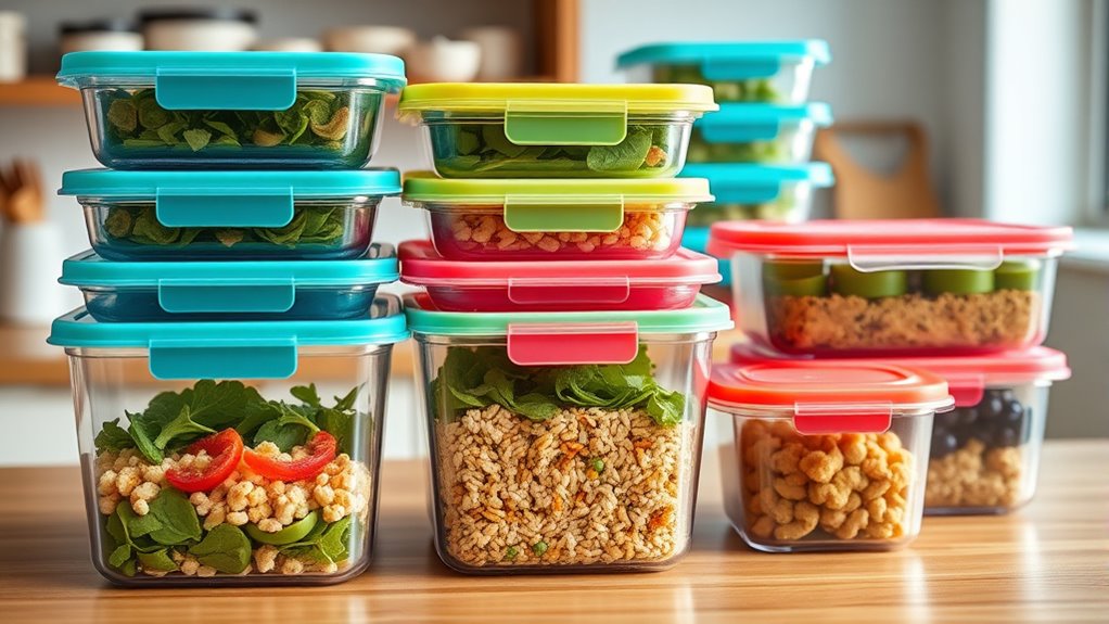 Choosing meal-prep containers that last requires paying close attention to the materials used. High-quality options like borosilicate glass or thick BPA-free plastics are essential because they resist cracking, warping, and staining over time. These durable materials can handle temperature changes, so they’re safe in the microwave, oven, freezer, and dishwasher without degrading. Borosilicate glass, in particular, is less prone to breakage and offers long-lasting performance compared to thinner plastics. Reusable containers made from sturdy materials are more cost-effective and eco-friendly since they maintain their integrity through many uses. Ultimately, the durability of a container depends on construction quality—thicker walls and reinforced lids help prevent cracks and leaks during daily handling, ensuring reliable food storage.