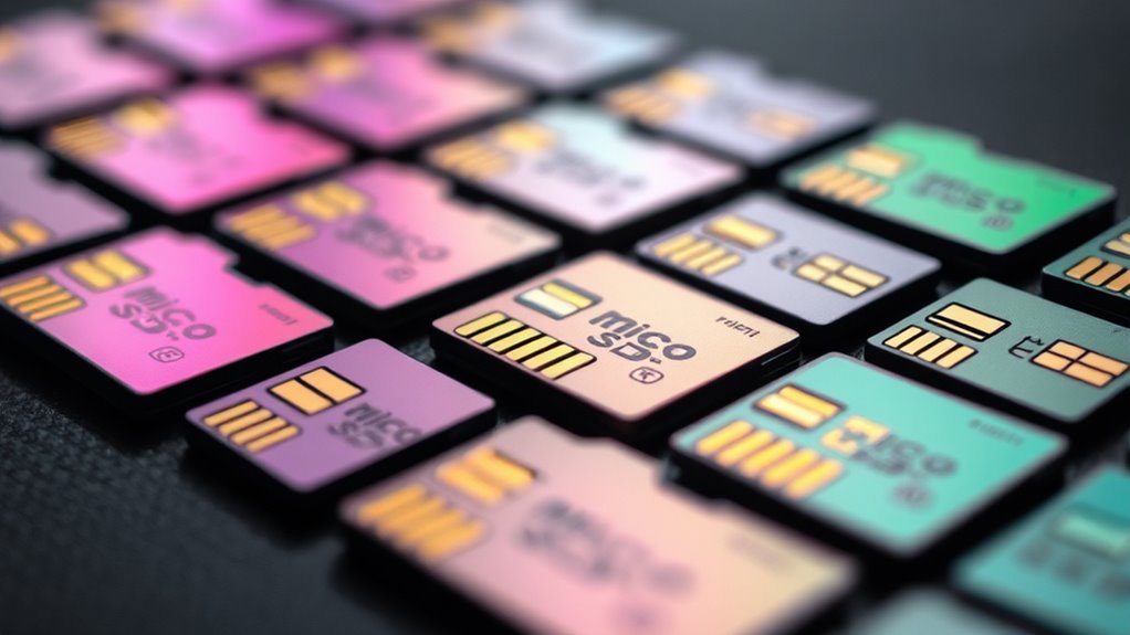 When it comes to encryption and security on microSD cards, I’ve noticed they vary quite a bit. Some offer hardware-based encryption, providing stronger protection for sensitive data, while others rely on software encryption, which can be less secure but more flexible. Features like password protection, biometric access, and secure element chips are common in higher-end cards. I always recommend checking these options to verify your data stays safe.