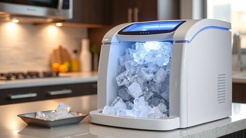 Indicator alerts play a essential role in making nugget ice makers easy to maintain. They notify me when the water level is low or the ice bin is full, preventing overflows and dry runs. These alerts help keep the machine running smoothly and avoid issues like mold or bacteria buildup caused by neglect. Many machines feature lights or signals for self-cleaning cycles, prompting me to initiate cleaning for better hygiene. Visual indicators also monitor the cleaning process, ensuring thorough sanitation without guesswork. Clear alert signals simplify maintenance routines, saving me time and effort. Overall, these alerts act as a reliable guide, helping me keep my ice maker clean, functional, and hygienic with minimal hassle.