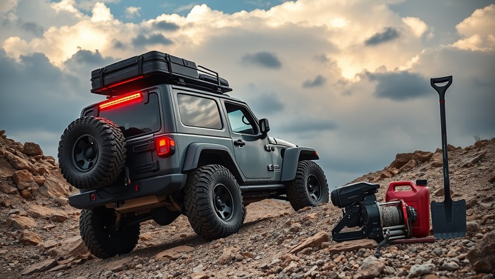 If you want to elevate your off-road adventures in 2025, I recommend gear like tire deflators, heavy-duty recovery tools, and off-road lighting. Items such as adjustable tire deflators with gauges, rugged tow hitches, and powerful LED floodlights can make a huge difference in performance and safety. Also, safety gear like inclinometer gauges helps you navigate tricky terrains. Stick with me, and I’ll show you how these accessories can transform your off-road experience.
