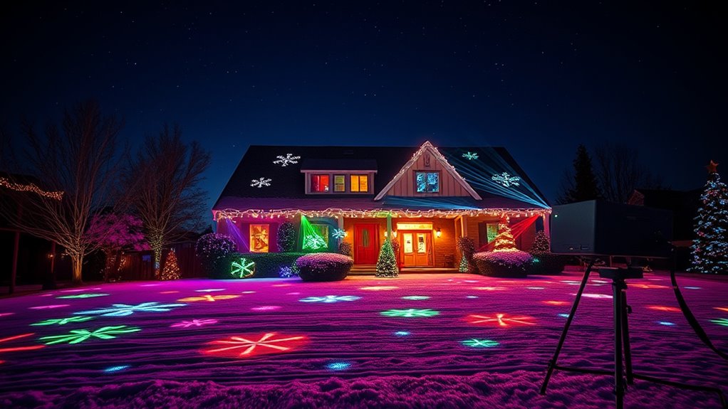 Imagine a symphony of lights dancing in perfect harmony—that’s what synchronized projectors can do for your holiday display. Yes, many outdoor Christmas light projectors can be synced via Wi-Fi or app control, allowing you to coordinate patterns and colors effortlessly. I’ve set up these systems myself, and it’s like conducting a festive orchestra. Just make certain your projectors support synchronization features and compatible control options for the best experience.