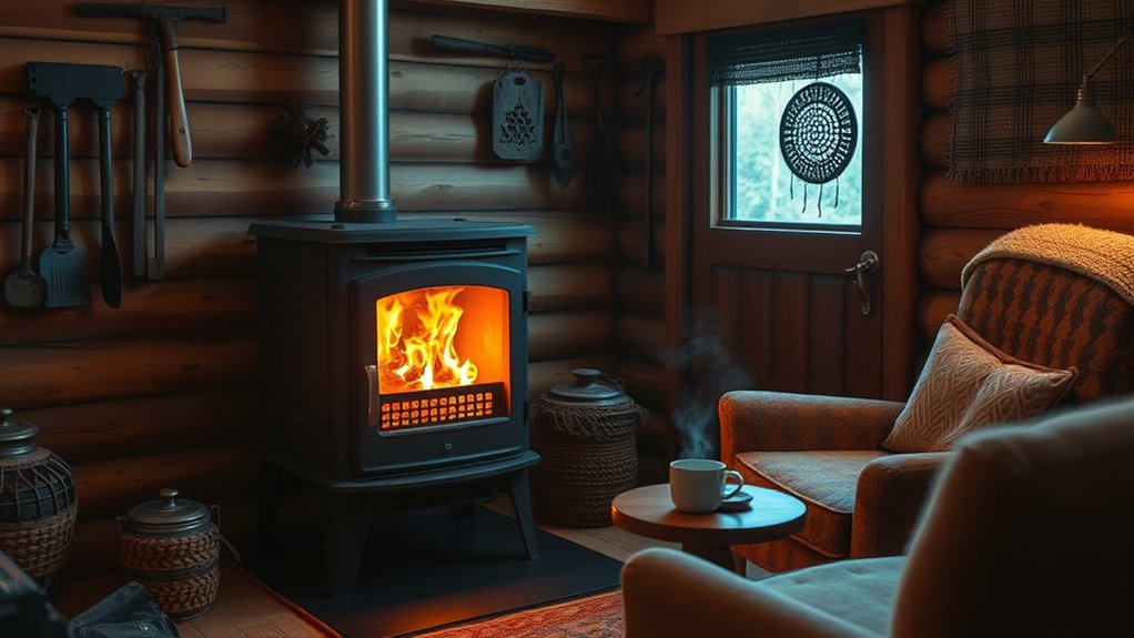 Imagine cozy evenings by a warm fire; that’s how these pellet stoves make me feel safe. They include essential safety features like automatic shut-off if overheating occurs, secure glass doors to prevent sparks, and oxygen depletion sensors that turn off the stove if ventilation is poor. These features give me peace of mind, knowing my cabin stays warm and safe, no matter how cold it gets outside.