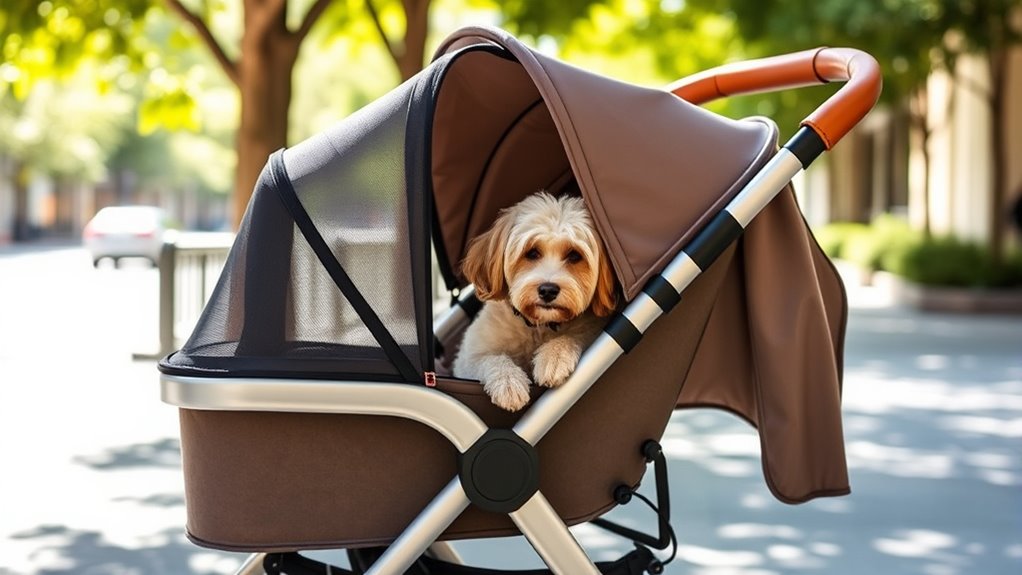 For pet owners seeking a stroller designed to comfortably transport larger dogs, a medium dog stroller built for pets weighing up to 66 pounds offers the perfect solution. Its spacious interior, measuring 12.6’’/27.6’’/15.7’’, accommodates dogs under 26 inches tall. The all-terrain wheels with full suspension guarantee smooth rides on grass, wood, or pavement. An adjustable handle makes it easy for everyone to push, while the foldable design simplifies storage. Safety features like lockable wheels, mesh ventilation, and sun shades keep your pet comfortable and secure. Plus, the waterproof fabric and ample storage make outings both practical and enjoyable.