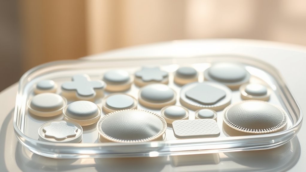 Since pimple patches come in various sizes and shapes, selecting the right one depends on your specific blemish. Smaller patches, around 8mm, are perfect for tiny whiteheads and discreet coverage, making them ideal for delicate areas. Larger patches, like 12mm or 14mm, cover bigger, inflamed breakouts or clusters of pimples, providing more surface area and better absorption. Some patches have unique shapes, such as star or rectangular designs, to better fit different parts of your face or body. Choosing the right size and shape helps guarantee the patch stays in place, absorbs impurities effectively, and looks natural during wear. The goal is a seamless blend with your skin, so pick options that match your blemish’s size and location.