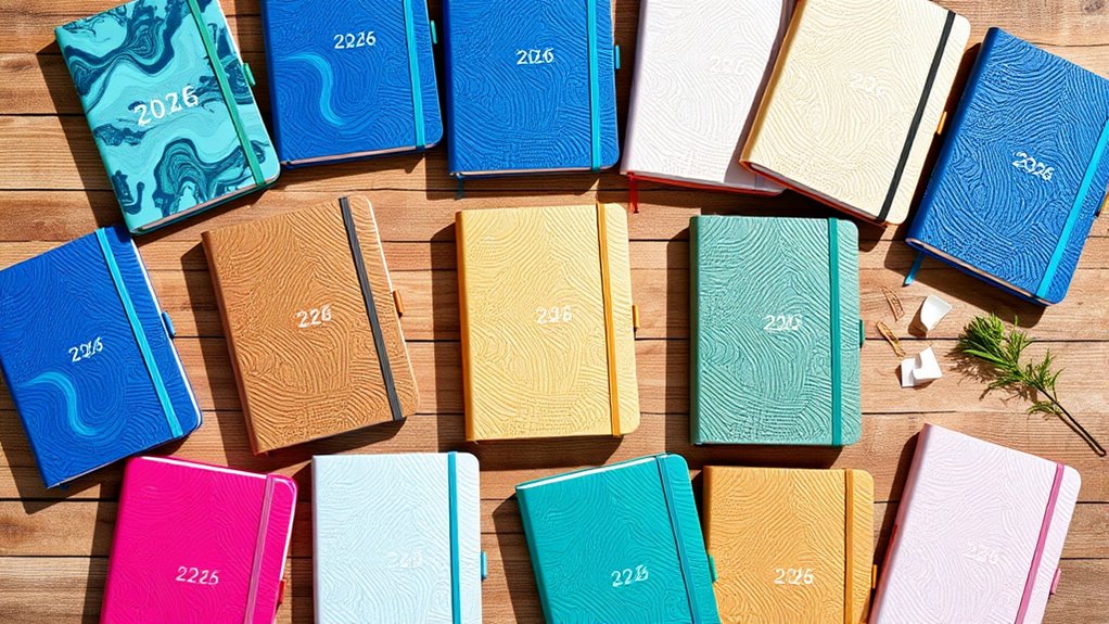 If you want to stay organized and ahead in 2026, I recommend checking out top planners with stylish covers, durable materials, and useful features like tabs and pockets. Options range from compact A5 sizes perfect for on-the-go planning to large formats for detailed schedules. Many include motivational extras, eco-friendly materials, and tailored layouts for work, school, and personal goals. Keep browsing to discover which planner fits your style and needs for a successful year ahead.