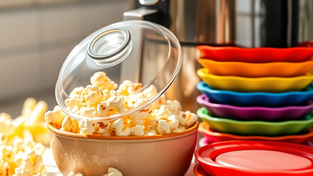 You’re wondering if silicone popcorn lids are BPA-free and food safe. I can tell you that most high-quality silicone lids are indeed BPA-free and made from food-grade silicone, meaning they’re safe for cooking and snacking. I always double-check product labels and manufacturer info to guarantee safety. Using food-safe silicone gives me peace of mind, knowing I’m not exposing myself to harmful chemicals while enjoying my popcorn.