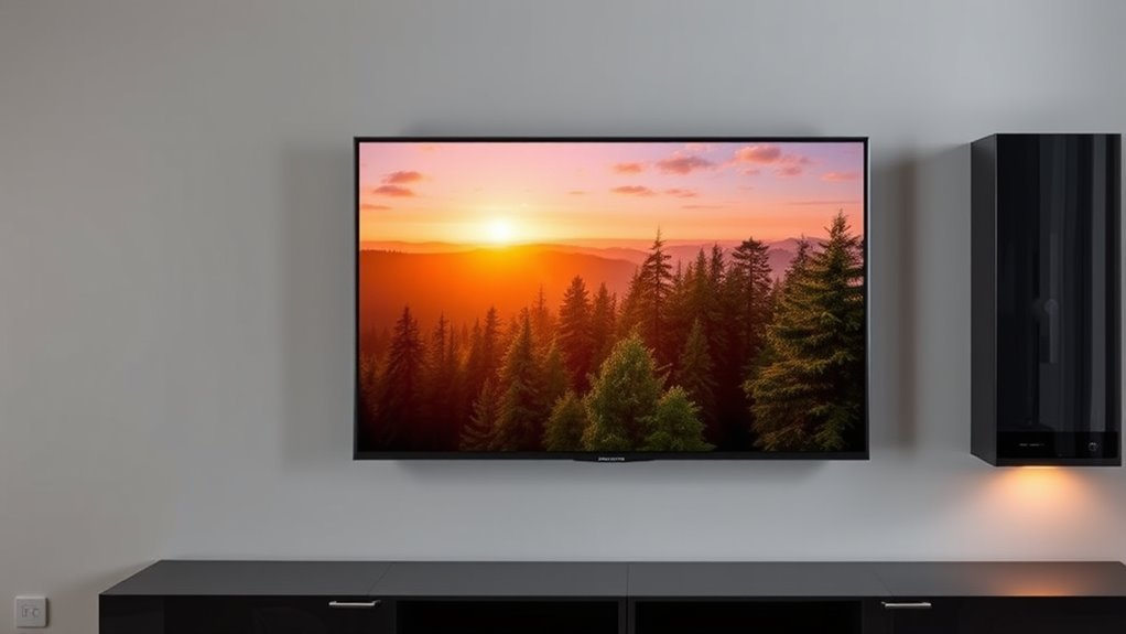 Smart features and compatibility are crucial factors that can substantially enhance your TV experience. I look for a TV that supports popular voice assistants like Alexa or Google Assistant, making voice control and smart home integration effortless. Compatibility with smart home devices lets me control lighting, thermostats, and security cameras directly through my TV, adding convenience. I also check for built-in streaming apps such as Netflix, Hulu, Disney+, and Prime Video to access my favorite content without extra devices. Features like Apple AirPlay enable easy sharing of videos, photos, and music from my Apple devices. Additionally, I ensure the TV’s operating system receives regular updates and supports third-party apps, keeping everything secure and compatible as technology evolves. These features make my smart TV more versatile and future-proof.