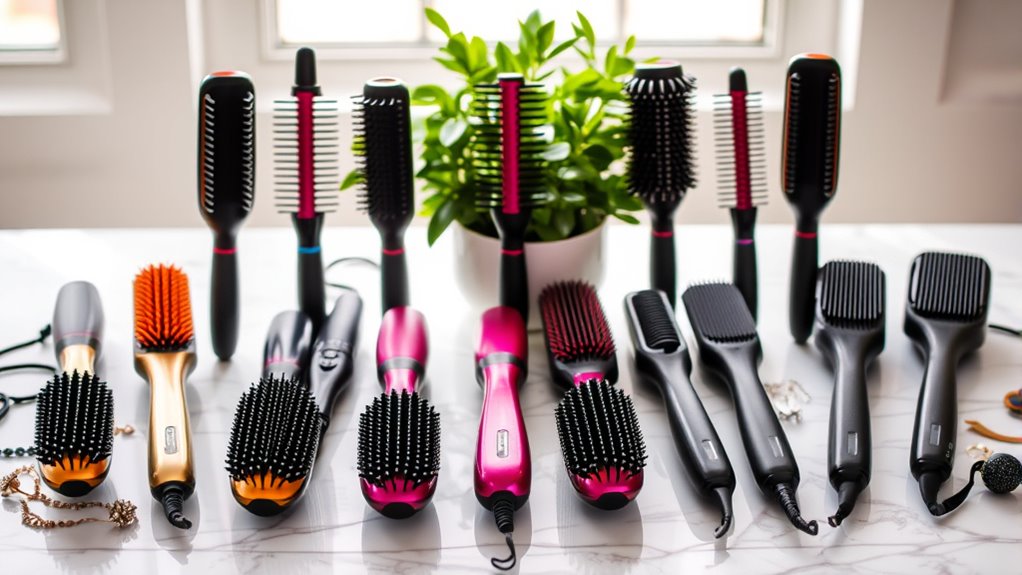 While exploring premium hair straightening brushes, you’ll quickly realize that heat settings flexibility is crucial for achieving the best results. A brush with a wide range of adjustable temperatures, typically from 180°F to 450°F, allows you to customize for your unique hair type, minimizing potential heat damage. With multiple heat levels, you can ensure that delicate strands aren’t overexposed while thicker or curly hair gets the heat it needs. Precise temperature control, often displayed digitally, helps maintain consistent heat, reducing the risk of damaging hot spots. Plus, the ability to lock in your preferred settings ensures stable performance throughout your styling session. This flexibility supports various techniques, whether you’re gently straightening or quickly smoothing your hair.