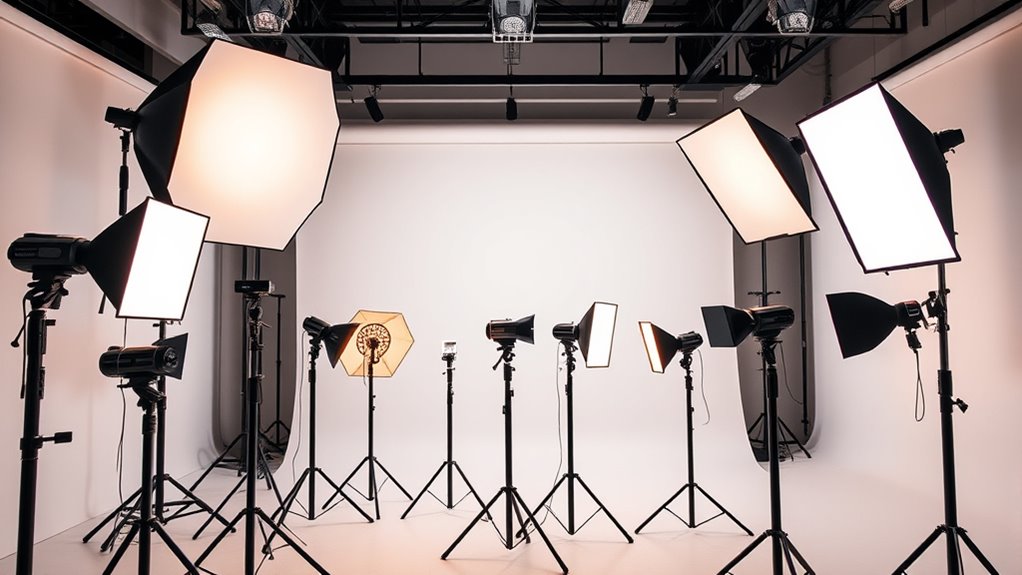 I’ve explored the top 15 premium studio lighting kits perfect for professional photography in 2025. These kits feature high-CRI LED panels, softboxes, and adjustable stands that deliver soft, even light ideal for portraits, products, and videos. They’re versatile, portable, and packed with options like remote control and customizable color temperatures. If you want to find out which setup suits your needs best and see detailed features, keep going to discover the options that will elevate your work.