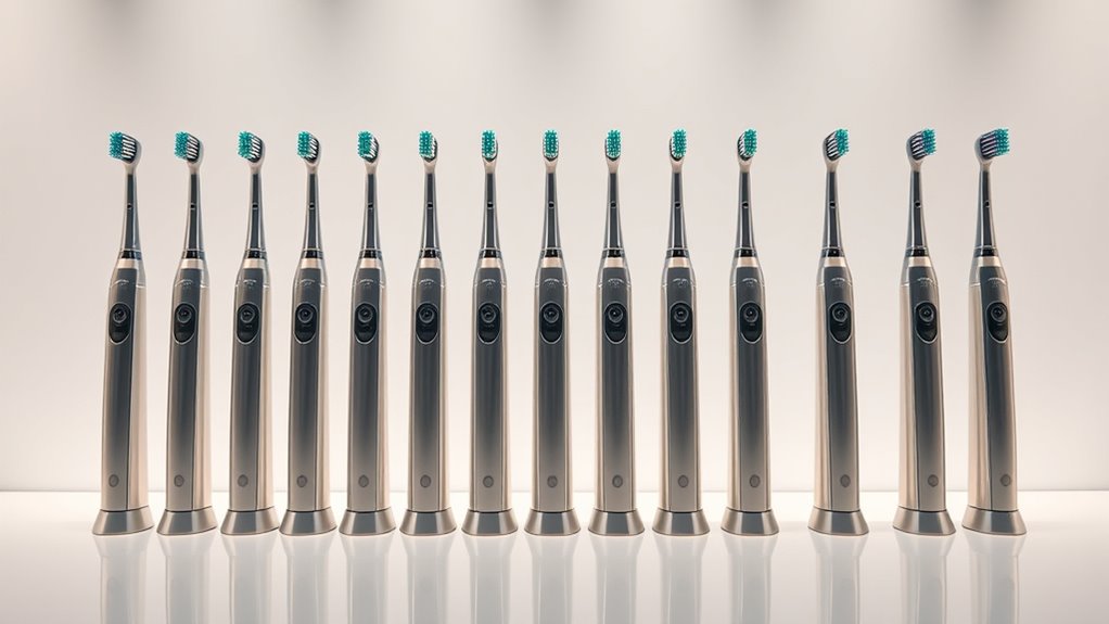 Choosing the right premium whitening toothbrush involves considering its technology and modes, as these features directly impact effectiveness and user experience. Advanced toothbrushes often offer multiple modes like surface stain removal, deep cleaning, and gum care, allowing for personalized routines. Many incorporate blue light or UV technology to activate whitening agents or sanitize brush heads, boosting oral hygiene. High-end models use sonic or oscillating vibrations, typically between 31,000 to 50,000 VPM, to break down stains effectively. Multiple modes and adjustable intensity levels let you tailor your brushing, especially if you have sensitive teeth or gum concerns. Some systems even include AI sensors and zone tracking, ensuring thorough coverage, optimizing whitening results, and preventing over-brushing or gum damage.