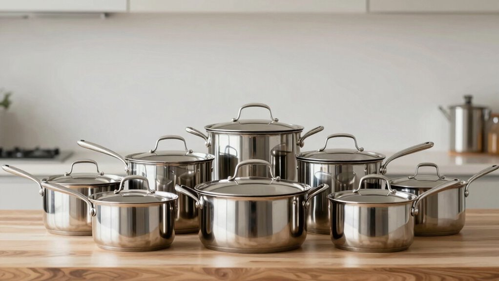 A well-constructed layered design lays the foundation for even heat distribution in stainless steel cookware, but the actual performance depends on specific features like the base thickness and material layering. A heavy-gauge base, at least 3mm thick, helps prevent hot spots and promotes uniform heat transfer. Incorporating layers of aluminum or copper sandwiched between stainless steel enhances thermal conductivity, allowing for rapid heat response and reduced temperature fluctuations. Impact-bonded or encapsulated bases ensure consistent heating across different cooktop types, whether gas, electric, or induction. This even heat distribution minimizes burning or uneven cooking, giving you better control over your culinary results. When choosing your set, focus on these core features to ensure reliable, professional-grade performance in the kitchen.