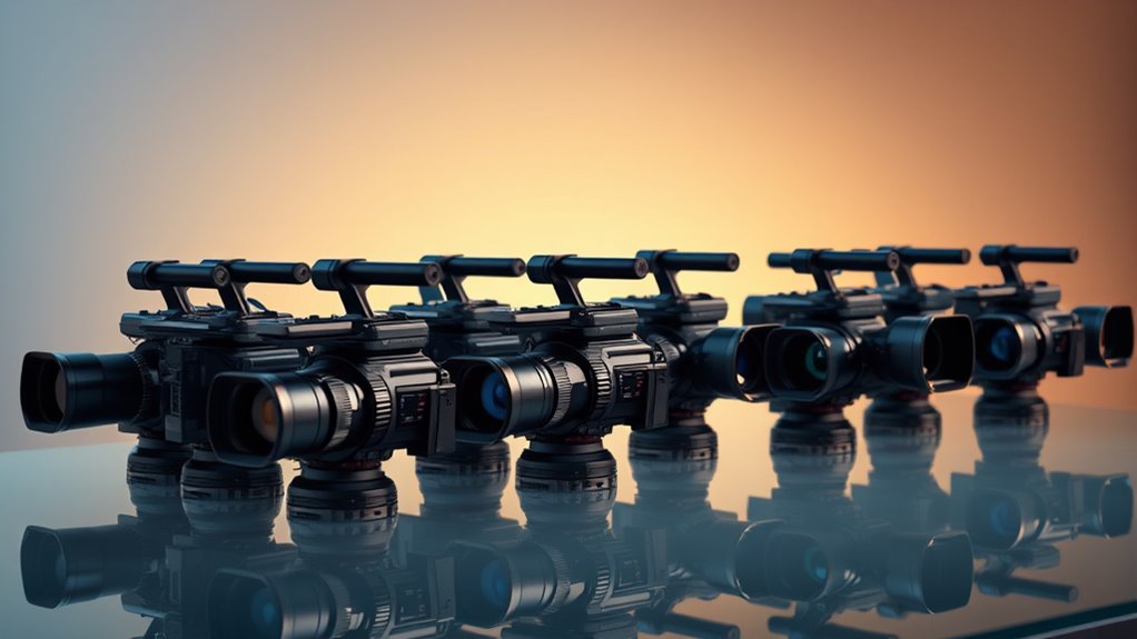 To excel in low-light conditions, a professional camcorder’s sensor size plays a crucial role because larger sensors can capture more light, resulting in clearer, more detailed footage in dim environments. Beyond sensor size, advanced night vision or infrared capabilities can considerably boost visibility in darkness. The lens aperture, measured in f-stops, also matters; wider apertures like f/1.4 let in more light, enhancing low-light sensitivity. High ISO settings paired with noise reduction technology help maintain clarity without grainy images. Additionally, features such as built-in LED lights or external lighting support can provide extra illumination when needed. Combining these elements ensures your footage remains sharp and vibrant even in challenging lighting conditions, making your professional camcorder versatile for various filming scenarios.