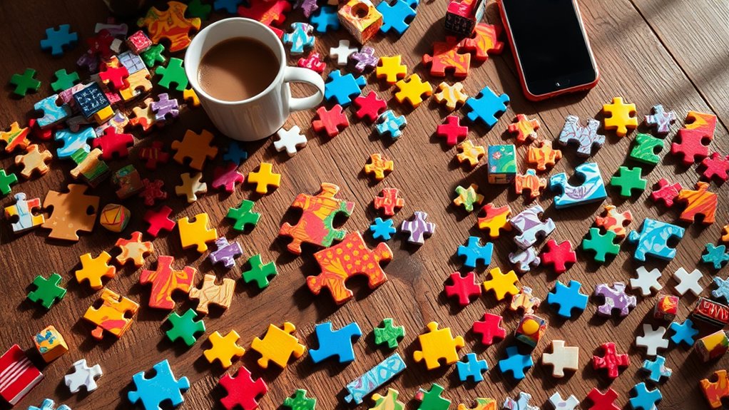A diverse mix of puzzle types keeps the mental challenge fresh and engaging for adults. By exploring word searches, logic puzzles, jigsaw puzzles, and brain teasers, I can stimulate different areas of my cognition. Incorporating various formats prevents boredom and encourages continuous mental growth. Each puzzle type demands distinct skills—like pattern recognition, spatial reasoning, vocabulary, or strategic thinking—providing a thorough workout for my brain. A well-rounded collection includes both visual and verbal puzzles, appealing to various interests and strengths. Plus, offering different difficulty levels means I can choose puzzles suitable for both casual play and more advanced challenges. Overall, puzzle type diversity ensures I stay motivated, sharp, and entertained while exercising my mind in multiple ways.