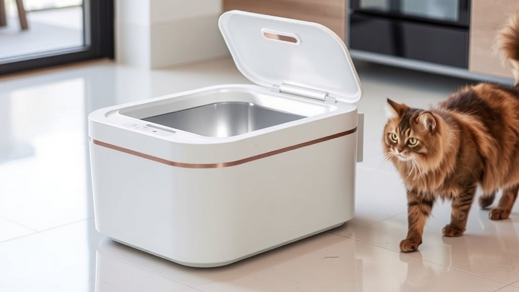 Effective odor control is essential for maintaining a fresh and comfortable home environment, especially with smart cat litter boxes that are designed for convenience. I look for models with sealed waste compartments, activated carbon filters, and deodorizing features, as these trap and neutralize smells effectively. Using high-quality clumping litter helps lock in moisture and odors better than non-clumping options. Regular maintenance is key—promptly emptying waste bins and replacing filters prevents odor buildup over time. Some boxes even have automatic deodorizer dispensers or odor-absorbing gels to keep things fresh between cleanings. Additionally, placing the litter box in a well-ventilated area and ensuring proper airflow remarkably reduces lingering odors, making your home more pleasant for both you and your cat.