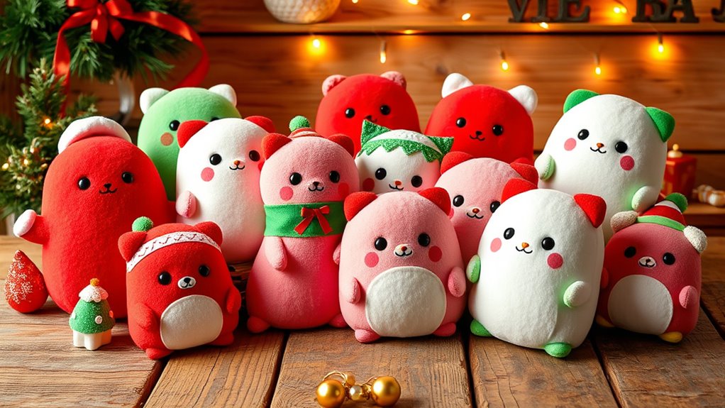 Looking for the cutest holiday Squishmallows for 2025? I’ve found the top 14 cozy collectibles, from limited-edition plushes like the Hello Kitty Gingerbread Cookie and Grinch to festive favorites like Rudolph and Richie the Christmas Axolotl. These plush toys come in various sizes, perfect for cuddling or decorating. To make sure you don’t miss out on the best ones, stick around—there’s more to discover about these seasonal favorites.