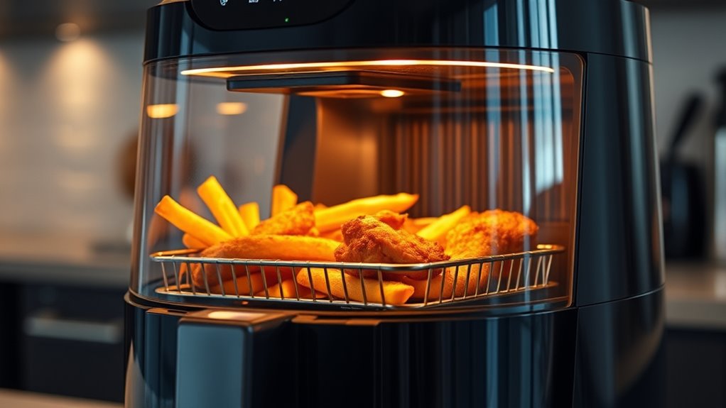 A key advantage of transparent air fryers is their ability to let you see the cooking process without opening the door, which helps maintain consistent heat and prevents food from losing moisture. This visual access allows me to monitor progress in real-time, reducing guesswork and the risk of overcooking or burning. Clear viewing panels or glass bowls let me check for doneness and ensure even cooking, especially with delicate items. Many models include interior lights, making it easier to see in low-light conditions and keep an eye on food without opening the appliance. Overall, this visibility enhances cooking accuracy and confidence, ensuring my dishes turn out just right every time. It’s a simple feature that makes a significant difference in the cooking experience.