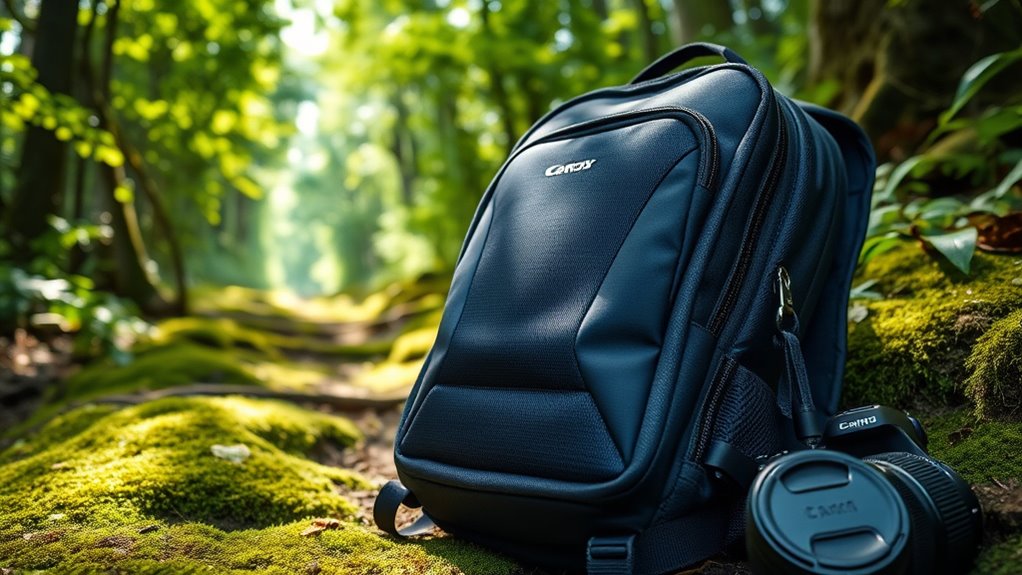 Durability and build strength are critical when selecting weather-sealed camera backpacks, especially for outdoor shoots where rugged conditions are common. High-quality backpacks are constructed with waterproof fabrics like high-density nylon or polyester that resist tearing and water penetration. Sealed zippers, often reinforced with storm flaps or waterproof coatings, keep water out during heavy rain or splashes. Reinforced stitching and sealed seam construction further enhance durability, ensuring the pack maintains its waterproof integrity under stress. Hard-shell panels or armored inserts provide added impact resistance, protecting your gear from shocks and rough handling. To guarantee they stand up to the elements, reputable brands test their backpacks with standardized water immersion and spray tests. This combination of materials and construction techniques guarantees your gear stays safe, no matter the weather.